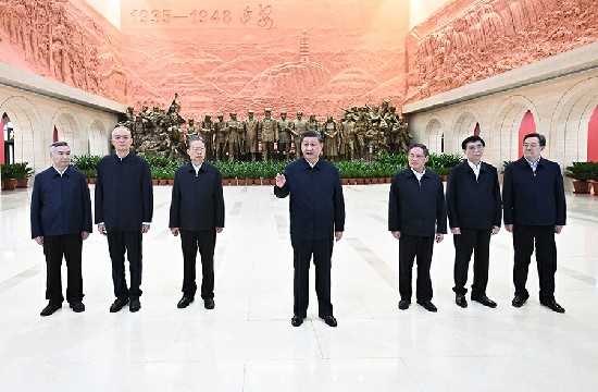 10月27日,中共中央總書記、國家主席、中央軍委主席習近平帶領中共中央政治局常委李強、趙樂際、王滬寧、蔡奇、丁薛祥、李希,瞻仰延安革命紀念地。這是習近平等在延安革命紀念館,參觀《偉大歷程——中共中央在延安十三年歷史陳列》。 新華社記者 燕雁 攝